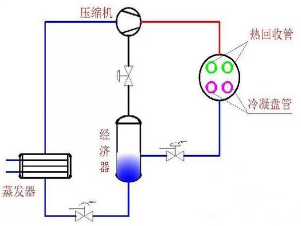 利用廢熱提供所需熱水,大大減少了供熱鍋爐向大氣排放的CO2氣體,減小溫室效應(yīng)。壓縮機(jī)的一部分熱量經(jīng)過熱回收器吸收以后,原冷凝器的熱負(fù)荷減少,熱交換效率提高,空調(diào)機(jī)組的效率提高,耗電量也顯著減少;同時(shí),采用熱回收技術(shù)以后,機(jī)組的負(fù)荷降低,使用壽命延長(zhǎng)。
